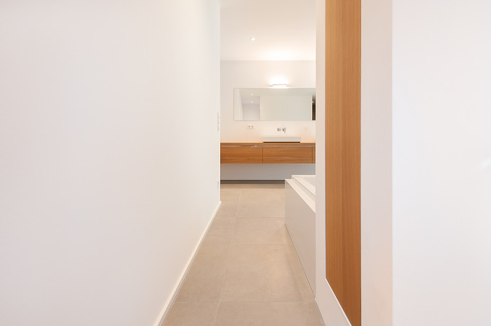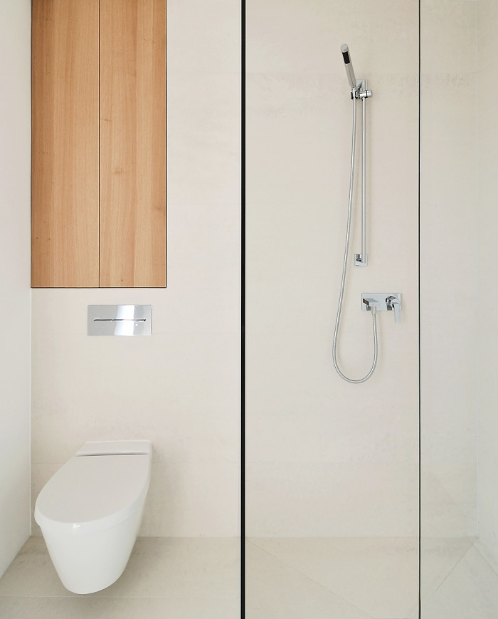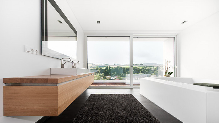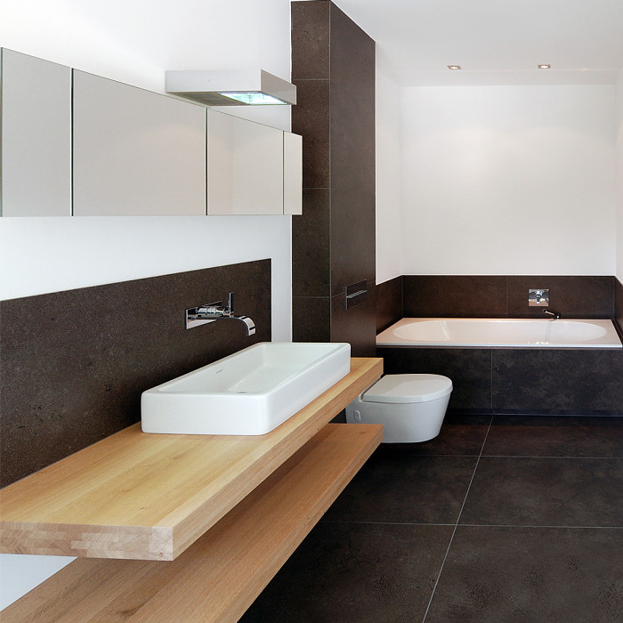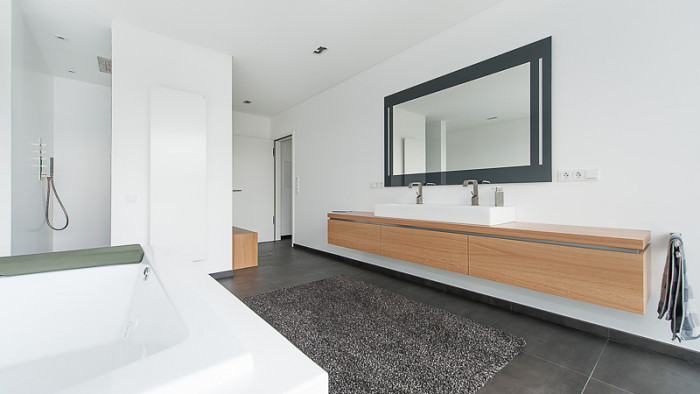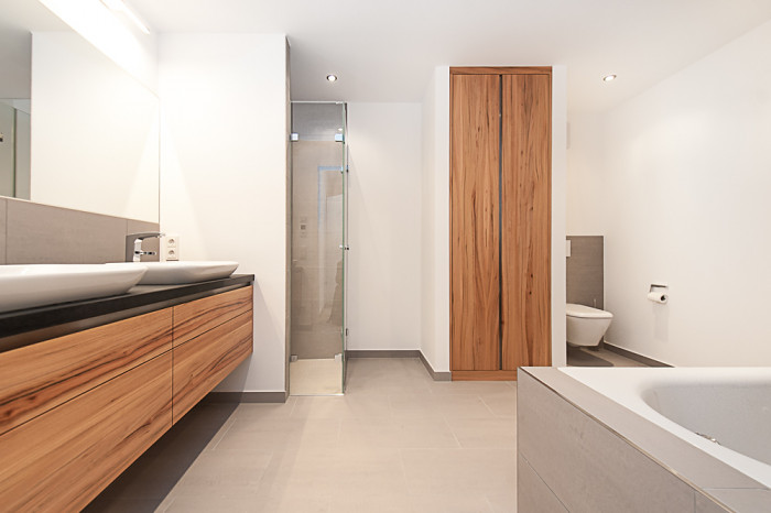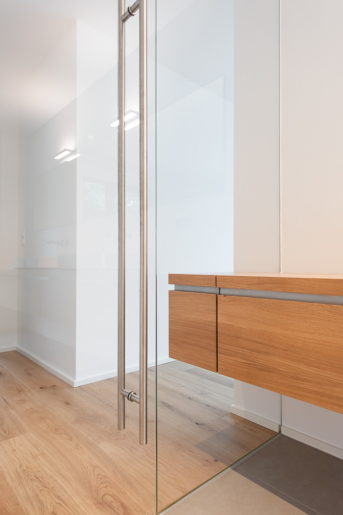 Wellness Oase - der Waschtisch als verbindendes Element durchrdringt die Raumtrennung aus Glas - Waschtisch mit Beleuchtung, Einbauschrank und Regalborde aus massiver Eiche