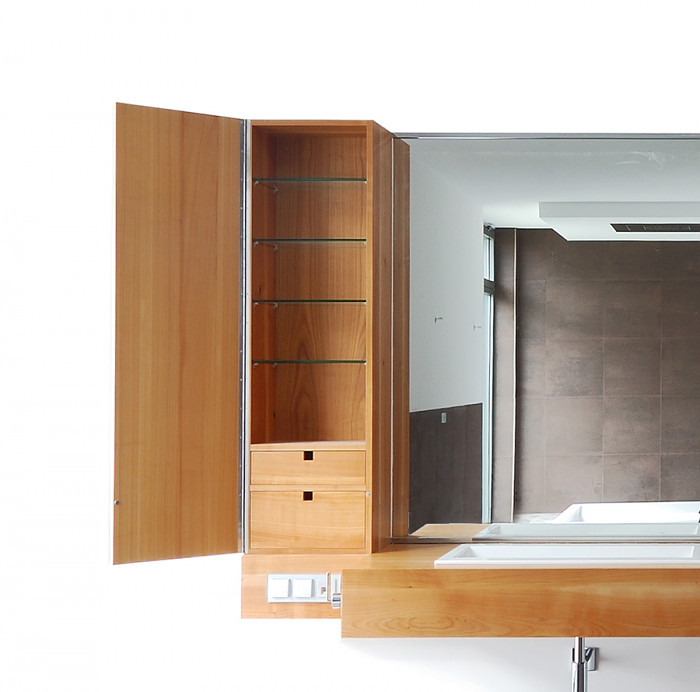 großzügiges Waschtischelement mit integrierten Becken, Spiegel und seitlichen Ablageschränken - heimischer Kirschbaum geölt / rotes Glas