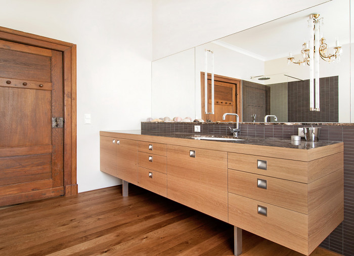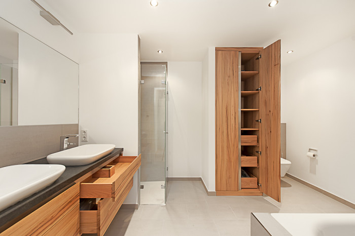 Waschtisch und Einbauschrank aus Rüster, Naturstein und Stahl