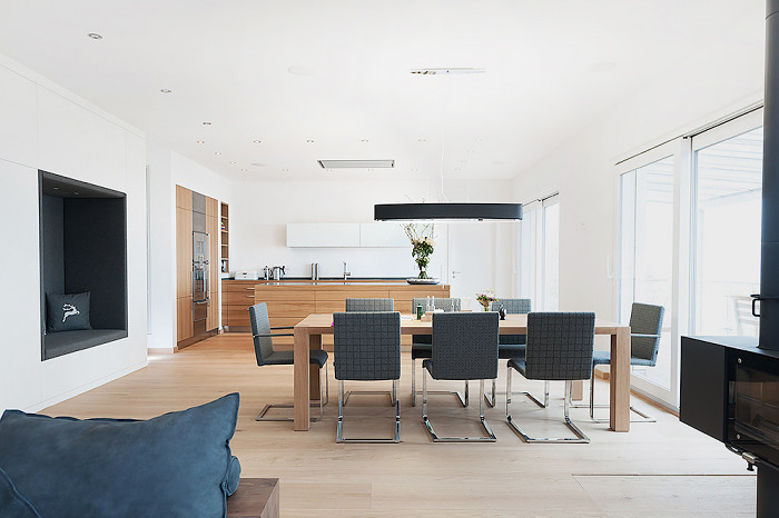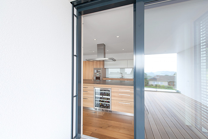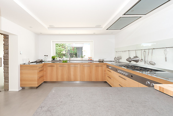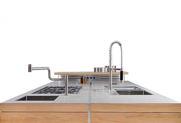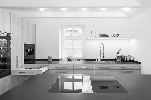 Kochen mit Leidenschaft und allen Sinnen; funktional pragmatisch und mit Liebe zum Detail. Flächenbündig fließen die Materialien ineinander: massive Eiche, Edelstahl und das Lavagestein Basalt. Durch die spezielle Verbindungstechnik wirkt der graue Basaltina millimeterdünn, elegant filigran und dennoch robust im Gebrauch.