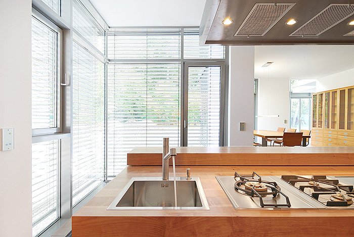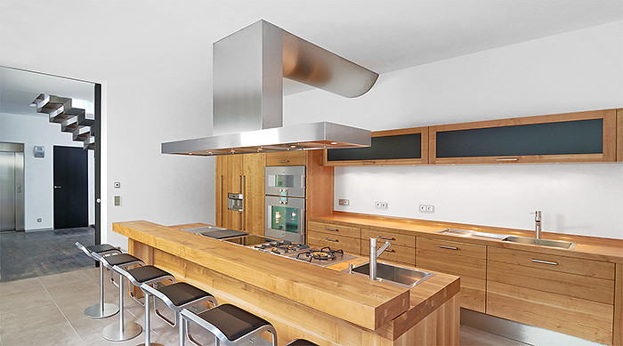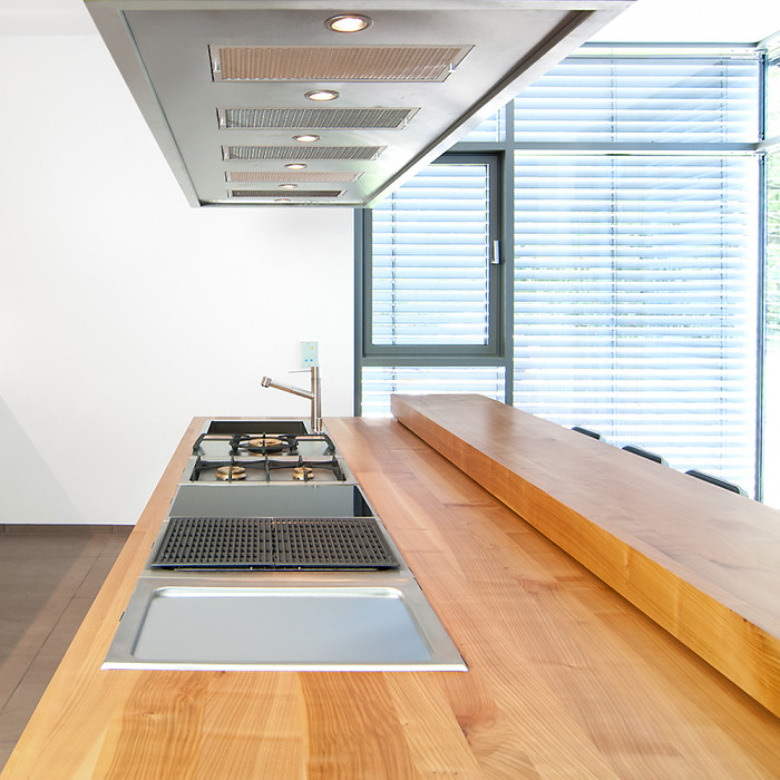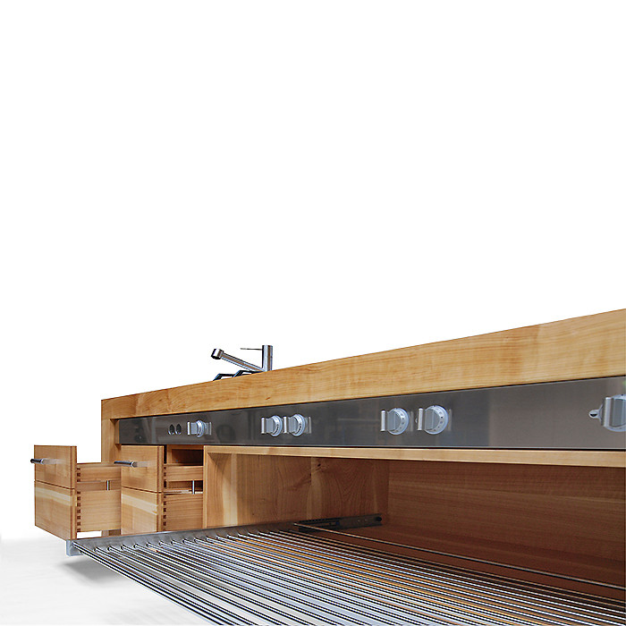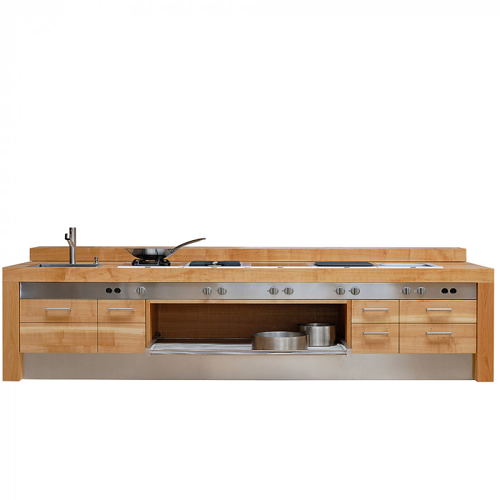 Braten, grillen, dünsten wahlweise mit Gas, Induktion oder Teppan Yaki. Der Küchenblock k_o8 zeigt sich funktional; mit elektrisch höhenverstellbarer Theke und Ausziehrost für Töpfe und Pfannen.