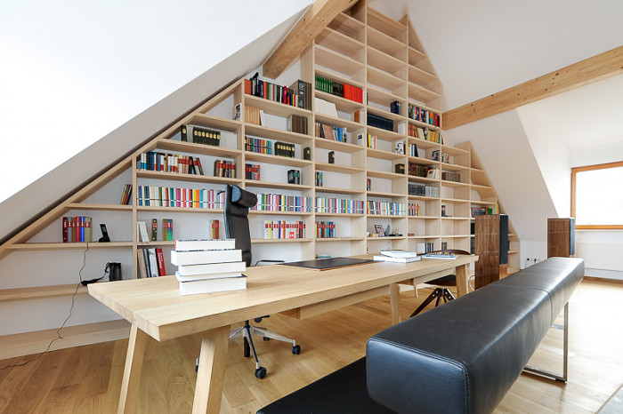 Foto oben: Tisch modell 7° rund Ahorn / Regale aus Weißtanne maßgefertigt für living room + home office . . . . . . .