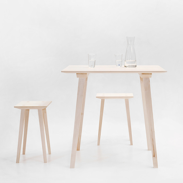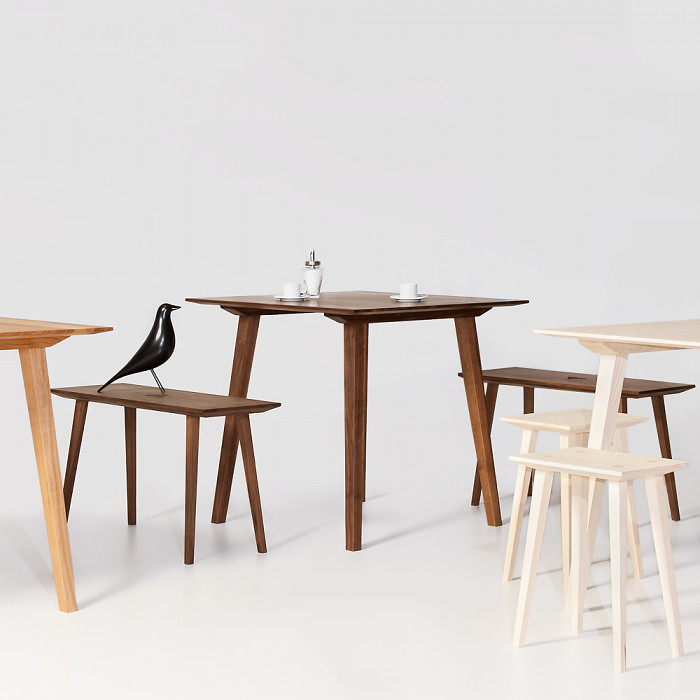 Verwendete Materialien sind feine und dennoch robuste Hölzer: schlichter Ahorn, feurige Kirsche, edler Nussbaum sowie helle Esche mit dunklem Kern, solide gefertigt in handwerklicher Präszision. Speziell entwickelte Verbindungstechniken erlauben die filigrane Materialstärke bei einem hohen Maß an Stabilität.