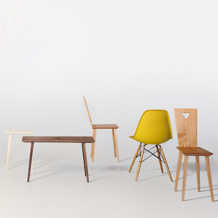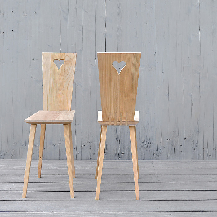 Zur Familie poe.tisch gehören Herzstuhl, Bank, Hocker und Tisch. Sie sind einzeln oder im Ensemble erhältlich. Abgestimmt auf die Serie werden die Tische in zwei Größen gefertigt 80 * 80 cm oder 120 * 80 cm, Sondermaße sind auf Anfrage möglich.