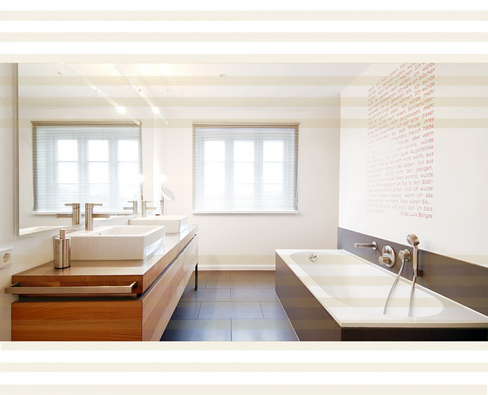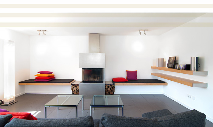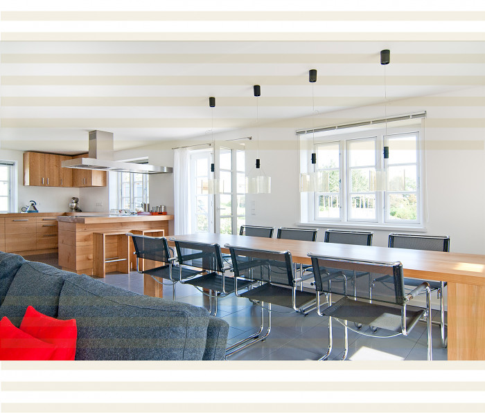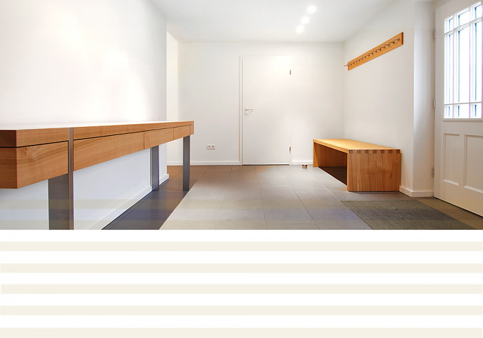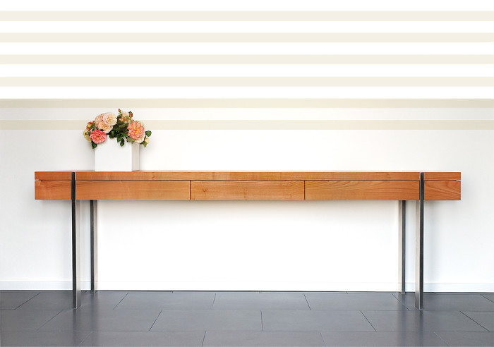 Kirsche, ein Holz mit lieblichem Charakter. Die Grautöne von Stahl und Steinfliese intensivieren den rötlich warmen Farbton des europäischen Kirschbaums. Ein Holz mit feiner Maserung und zarter Haptik. Umfang des Projekts; Möbel für Küche, Ess- und Wohnbereich, Schlafräume und Bäder.